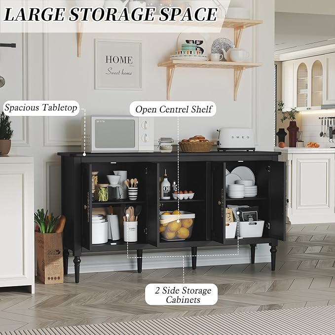 Vintage Buffet Sideboard Cabinet with 4 Doors, 59" Mid Century Modern Storage Cabinet with Shelf, Decorative Accent Credenza TV Stand (Black)