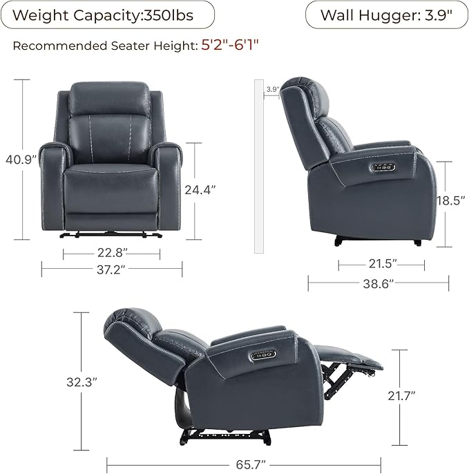 - Space-Saving Wall Hugger Design: Perfect for small spaces, this wall hugger recliner needs only 3.9 inches of wall clearance—the seat moves forward while reclining, eliminating gaps. Supports 350 lbs and suits users 5'2"-6'1”for compact yet sturdy relaxation. Dimensions: 38.6''D x 37.2''W x 40.9''H.