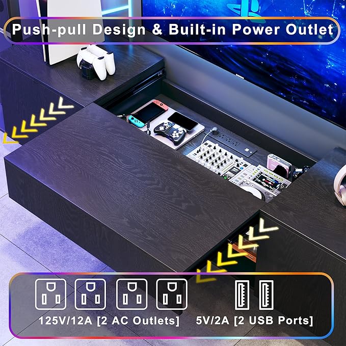 - Push-pull Design & Power Outlet : Our black 71'' TV stand is designed with a sliding cover to protect against dust and conceal the use of exposed cables. It comes with 2 built-in USB ports, 2 standard outlets and 2 cable holes to power your appliances.