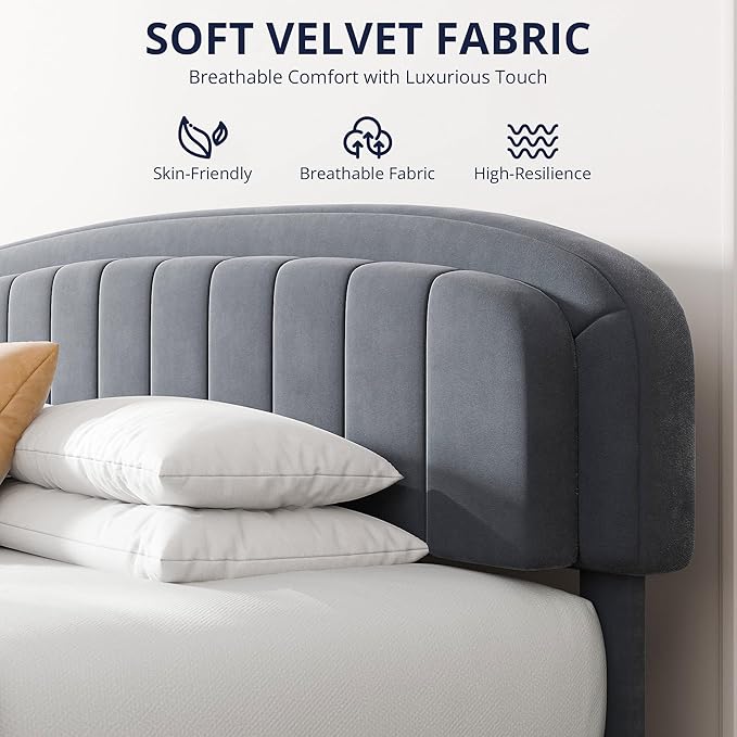 Cozy Castle King Size Bed Frame, Upholstered Platform Bed with Velvet Adjustable Curved Headboard, Mattress Foundation with Strong Wooden Slats, No Box Spring Needed, Easy Assembly, Gray