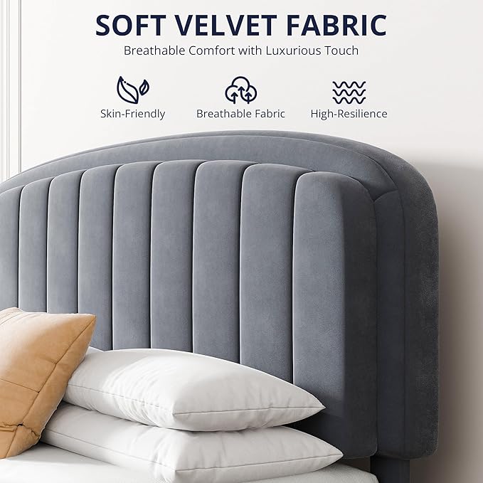 Cozy Castle Queen Bed Frame, Upholstered Platform Bed with Velvet Adjustable Curved Headboard, Mattress Foundation with Strong Wooden Slats, No Box Spring Needed, Easy Assembly, Gray