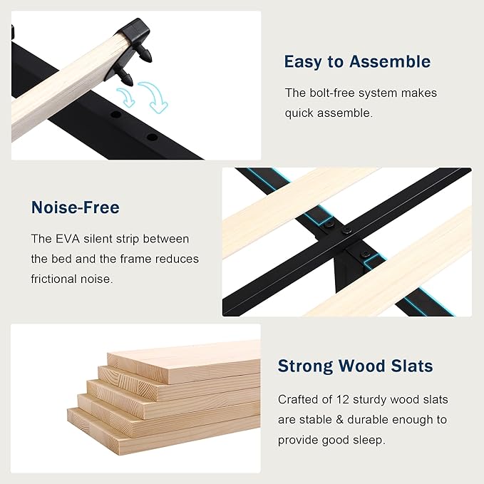 - Built to Last, Whisper Quiet: This bed is crafted from a durable metal frame and 12 sturdy wooden slats and ensures exceptional stability. The EVA mute bar of solid wood slats eliminates noise, giving you a peaceful, squeak-free sleep experience