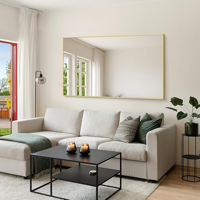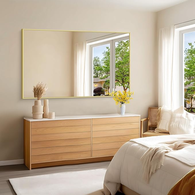 - Modern Design:KOCUUY 60"x36" gold vanity mirror is with innovative design which gives the wall mirror a more fashion feel. With a classic square corner, the wall mounted mirror allows for creativity and functionality in bathroom, bedroom, entryway and anywhere else. Let your living space be an expression of your personal style, not limited to modern or contemporary, farmhouse or industrial.