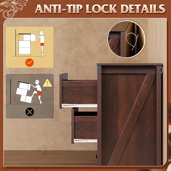 - đăFarmhouse 9 Drawers DresserăThis wooden dresser farmhouse look is heightened by the rustic color finish coupled with the side barn sign and the dark square handle adds a rustic charm. It can be used for bedroom clothing organizer, entryway table, decorative storage for living room.