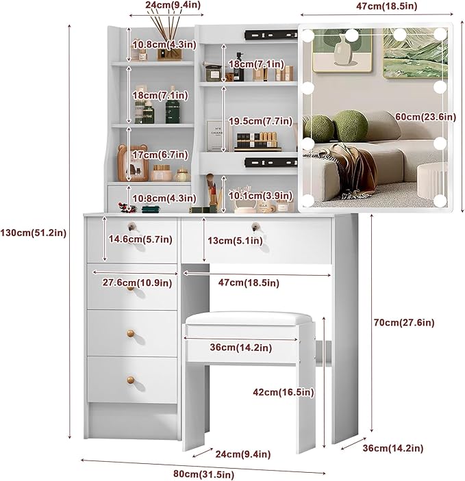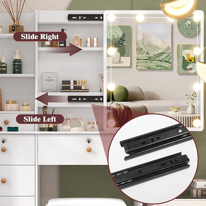 - 【Keep Everything in One Place 】 With 6 spacious drawers, 3 open shelves, and 3 hidden compartments behind the sliding mirror, this white vanity offers generous storage for all your makeup, skincare, hair tools, and accessories. Say goodbye to cluttered countertops.