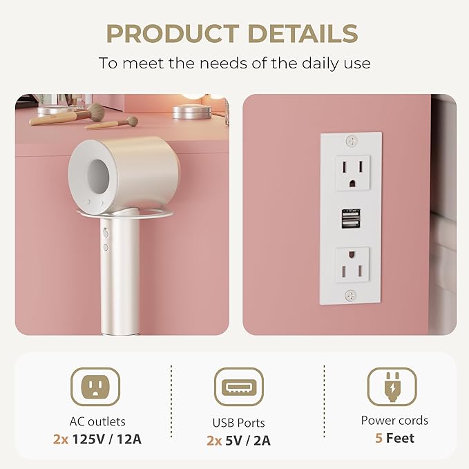 - 【Well-designed Functions】Charging station of vanity table has 2 standard sockets and 2 USB ports, which is convenient for you to use the hair dryer and charge other mobile devices. The hair dryer holder of the dressing table is convenient for you to store the hair dryer.