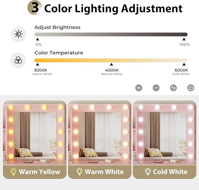 - 【Vanity Desk with Mirror and Lights】The makeup vanity desk mirror is equipped with 12 adjustable LED bulbs, you can adjust the three light modes of cool white, warm white and warm yellow as well as the brightness of each mode to help you create a perfect makeup.