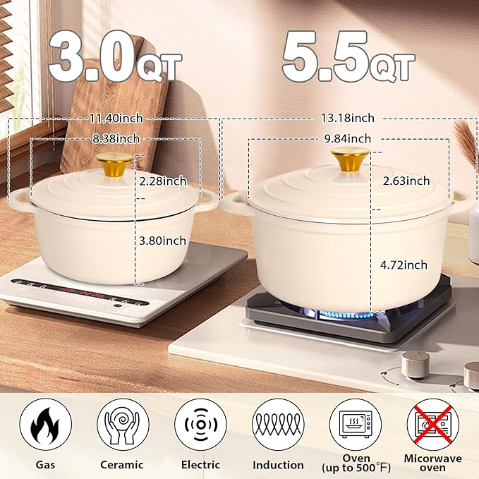 Romswi Enameled Cast Iron Dutch Oven Set - 3qt & 5.5qt Dual Combo - 7-Layer Professional Grade Dutch oven pot with lid - Oven Safe for Braising, Stews, Roasting, Bread Baking - White Bread Dutch Oven