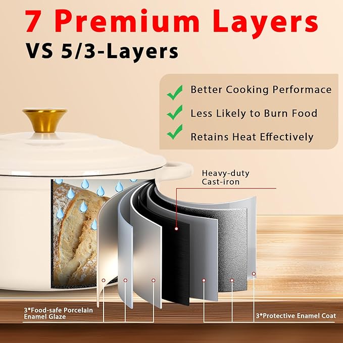 - 7-Layer Superior Construction: Triple-enamel coating + 4-layer cast iron core ensures unparalleled heat retention (30% better than standard Dutch ovens) and chip-resistant durability