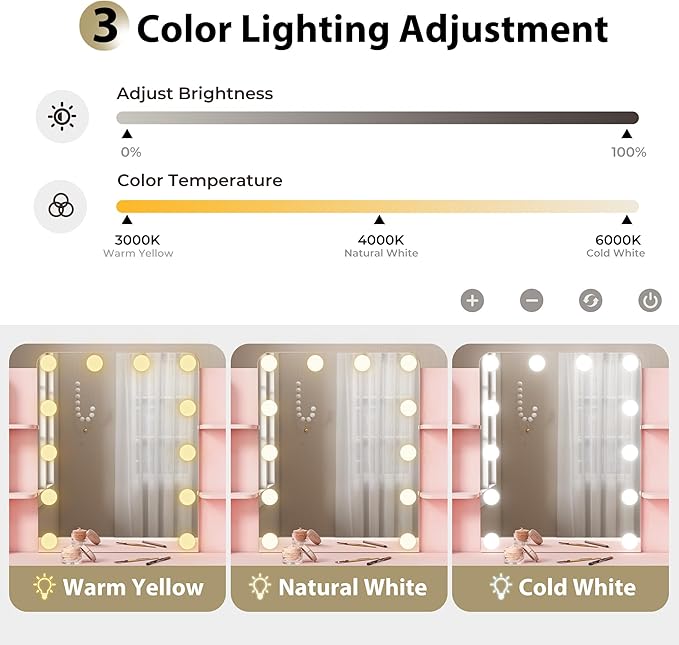 - 【High-Definition Mirror with Adjustable Lighting】The vanity desk is equipped with a large, high-definition mirror that enhances your makeup experience. It features three adjustable lighting modes—warm yellow, warm white, and cool white—allowing you to customize the ambiance to match different times of day or personal preferences.