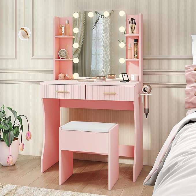 Small Vanity Desk with Mirror and Lights, Makeup Vanity Desk with 3 Color Modes Adjustable Bulb, 2 Large Drawers and 4 Open Storage Shelves, Pink Vanity with Charging Station for Bedroom