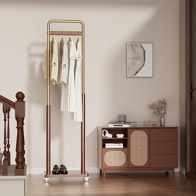 Clothes Rack Solid Wood Coat Rack, Metal and Solid Wood Combination Clothing Rack with Wheels for Entryway, Bedroom, Living Room, Coat Racks Freestanding for Hanging Clothes Garment Scarf
