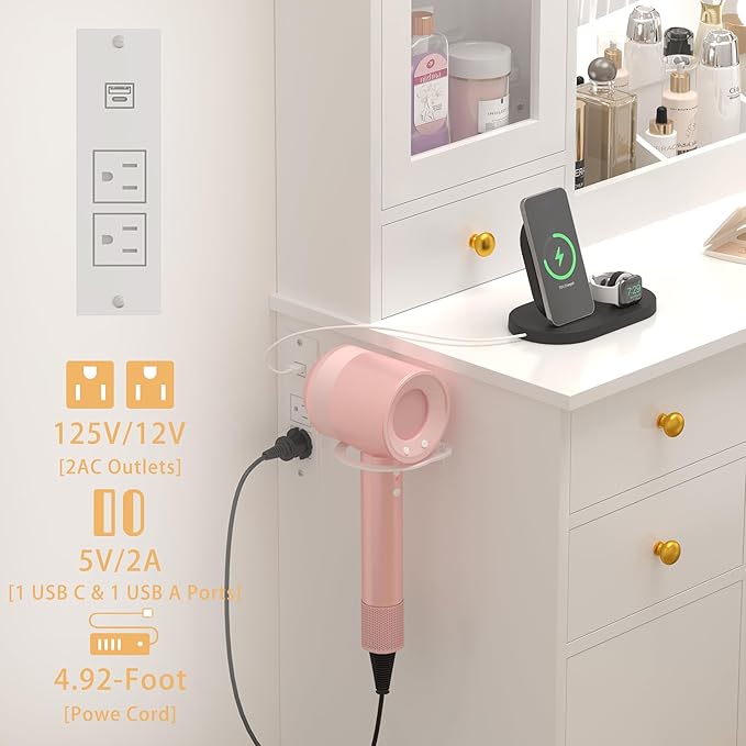 - 【Convenient Built-in Power Outlet & Hair Dryer Rack】Equipped with 2 standard AC outlets, 2 USB charging ports, and a dedicated hair dryer rack, this vanity desk makes your beauty routine effortless. Charge your curling iron, phone, and other devices directly at your vanity without hassle. Designed with women’s daily needs in mind.
