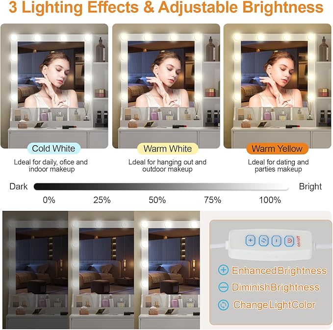 - 【 Vanity Desk with Mirror & 3 Lighting Modes】The lighted makeup vanity mirror features 3 adjustable light settings—3000K warm yellow, 4500K warm white and 6000K cool white—so you can apply makeup in any lighting condition. Whether for daytime or evening looks, this vanity desk with mirror and lights helps you achieve flawless results every time.