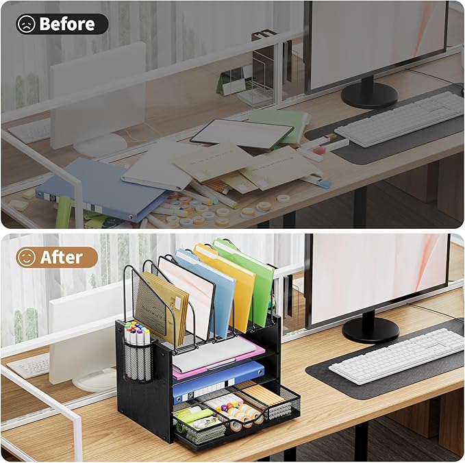 - 【Multifunctional Desk organizer】Our upgrade desktop file organizer has vertical and horizontal storage space – 4 Tiers +5 vertical sorters +3 compartments drawer+ additional 2 pen holders . Upright section has five 2" Compartments for magazines, bill, file, book. Three types of use to meet your various office needs!!