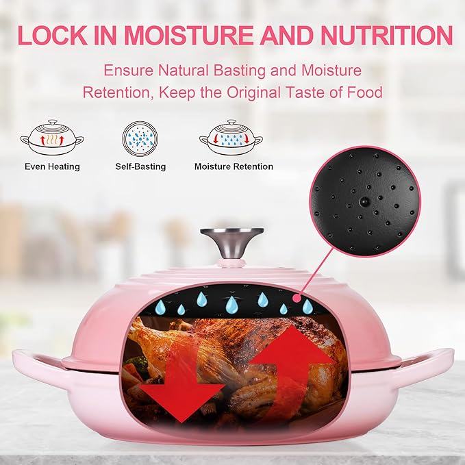 - DOME LID & SHALLOW BASE: The cast iron dutch oven with a tight-fitting dome shaped lid for the bread nicely rising, Sealing the steams and locking in moisture, Self-basting to make the bread crust golden crispy and inside soft, The shallow base easier to gently place the dough and remove the bread ensuring the shape more professional and beautiful