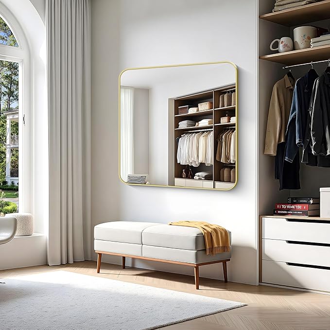 Gold Bathroom Mirror, 42x42 Inch Metal Framed Square Mirror, Rounded Corner Gold Vanity Mirror, Large Wall Mounted Mirrors for Living Room Bedroom Entryway Hangs Horizontal or Vertical
