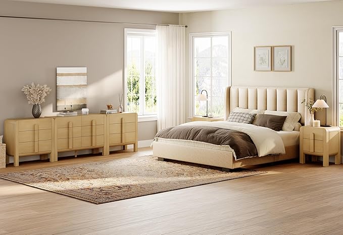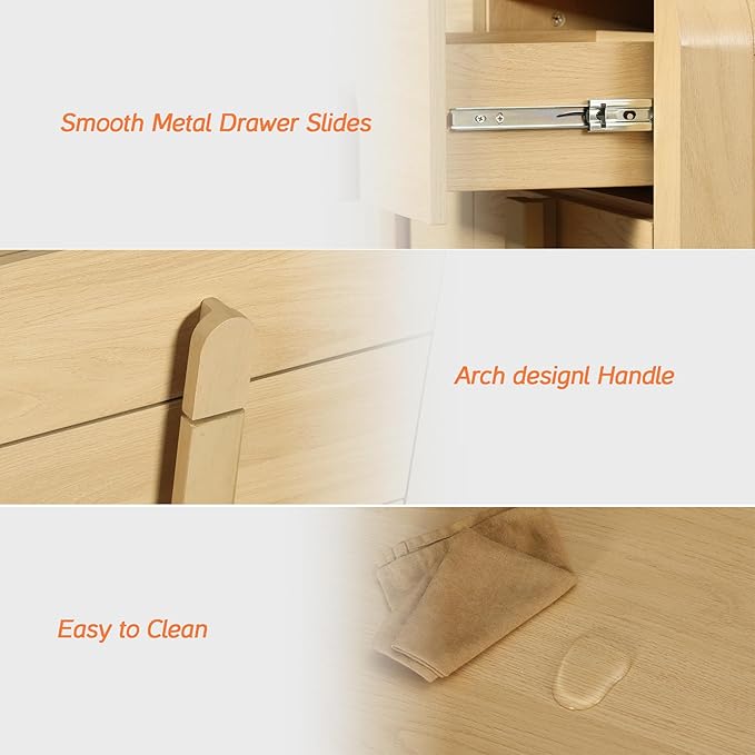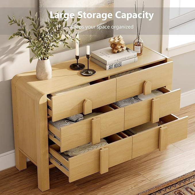 - MID-CENTURY MODERN STYLE & DURABLE BUILD: Crafted from premium engineered wood with a water- and scratch-resistant finish, this mid-century modern dresser set combines durability with timeless aesthetics. The smooth curved edges and arched wood handles add a vintage yet refined farmhouse feel—perfect for fans of oak dresser, wooden dresser for bedroom, or vintage dresser looks.