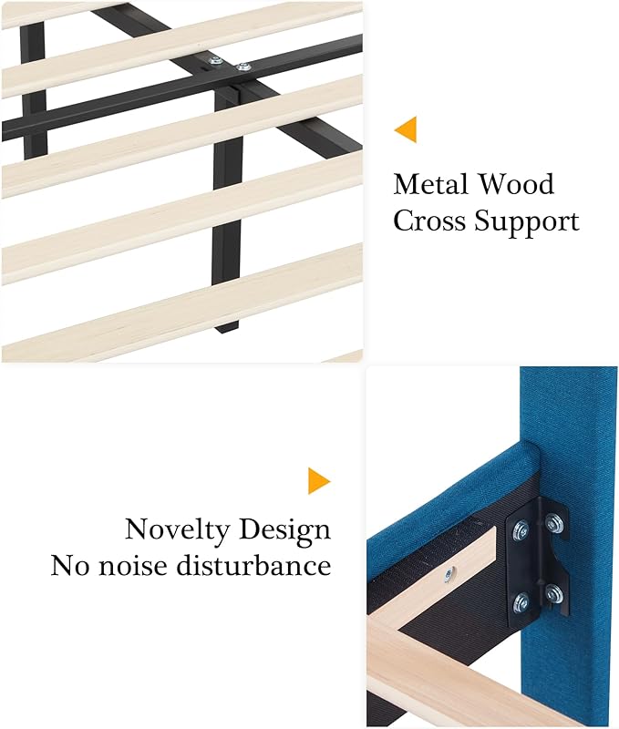 - 【Upholstered Bed Frame】 Heavy metal frame and 12 solid wood slats compose a central "+" structure to offer up to 800lbs weight capacity, You can spend relaxing time with your family. Smooth and strong solid wood feet can avoid scratching your floor.