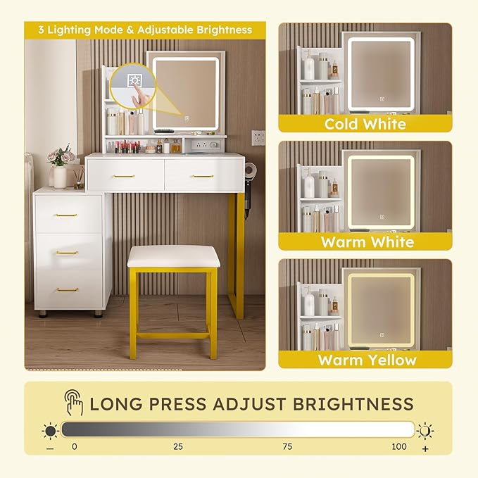 - 💡 【Makeup Vanity with LED Lights】Illuminate your beauty routine with our vanity with lights! This makeup vanity features touch-sensitive LED lighting with three adjustable color settings, perfect for any occasion—day or night. Whether you're perfecting your makeup or taking selfies, this vanity desk with mirror and lights ensures you're always looking your best.