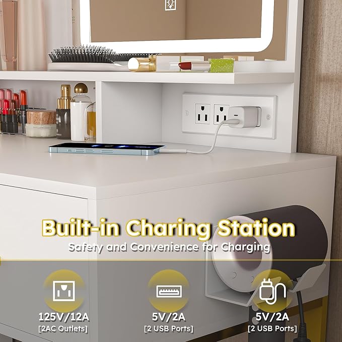 - 💡 【Convenient Power Outlet & Hair Dryer Rack】Our vanity desk with mirror comes with two AC power outlets and two USB ports, making it easy to charge your devices or plug in your hair dryer and curling iron. The built-in hair dryer rack allows you to keep styling tools handy, making your beauty routine more efficient and hassle-free.