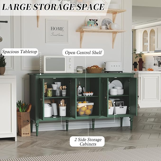 Vintage Buffet Sideboard Cabinet with 4 Doors, 59" Mid Century Modern Storage Cabinet with Shelf, Decorative Accent Credenza TV Stand (Green)
