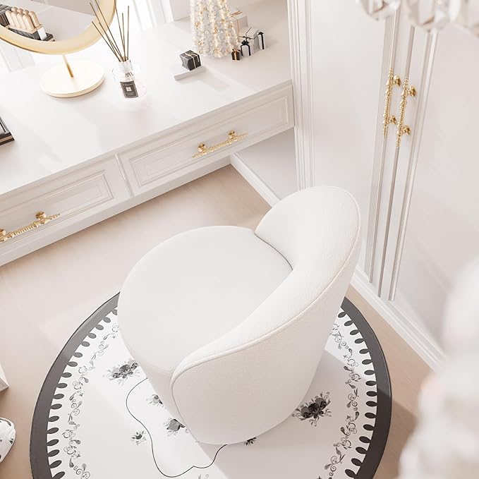 YOUNIKE Vanity Bench Boucle Fabric Beige Solid Wood Swivel Accent Chair with Backrest Easy Assembly Dressing Stool for Bedroom & Makeup Room