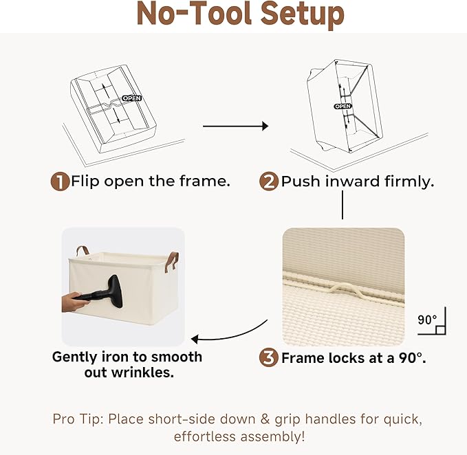 - Premium Quality: Made from high-quality fabric and reinforced with a heavy-duty MDF bottom board and a sturdy metal frame. The solid construction enables the storage bins to stand upright without support, even when empty.