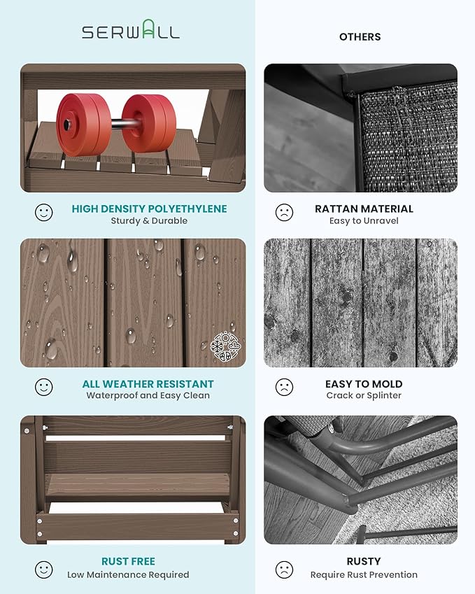 - 【Low Maintenance】HDPE dining table sets required low maintenance. Unlike the Steel dining sets may require rust prevention, SERWALL patio dining table and chairs are easy to clean with just soap and water, requiring minimal effort to keep them looking fresh.