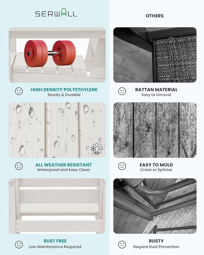 - 【Low Maintenance】HDPE dining table sets required low maintenance. Unlike the Steel dining sets may require rust prevention, SERWALL patio dining table and chairs are easy to clean with just soap and water, requiring minimal effort to keep them looking fresh.