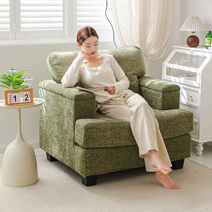 Oversized Accent Chair with Armrest Storage,38”W Big Armchair with 7.8'' Thick Cushion,Deep Seat,Large Comfy Reading Chair, Living Room Chairs,Sofa Chair for Bedroom,Chenille,Green
