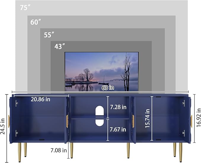 HLR 63''Modern TV Stand for 65/70/75 inch TV, Entertainment Center with Storage Cabinet, Mid Century Blue TV Stand,Embossed Pattern TV Console, TV Media Console for Living Room, Bedroom