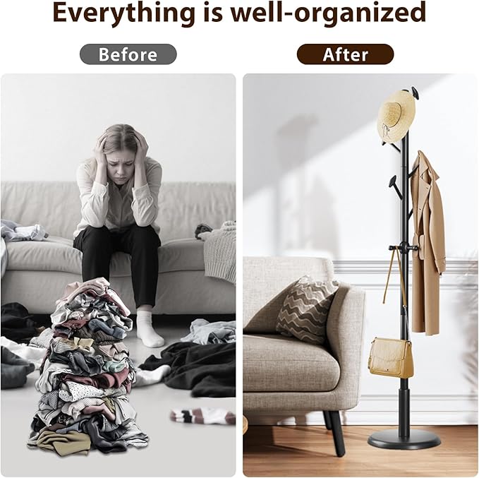 - Inspired by Natural Branches: The unique tree-shaped design allows you to incorporate natural design into your home. This freestanding coat rack features six 45-degree angled hooks to prevent your clothes from falling; the four lower hooks rotate smoothly for easy access