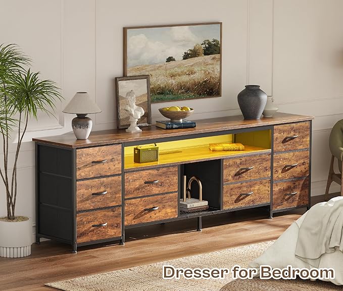 Huuger 70.9 Inch LED TV Stand Dresser with Power Outlets, USB-C Port and LED Lights, 10 Fabric Drawer Dresser for Bedroom, Long Entertainment Center for 75, 80 Inch TV, Open Shelves, Rustic Brown