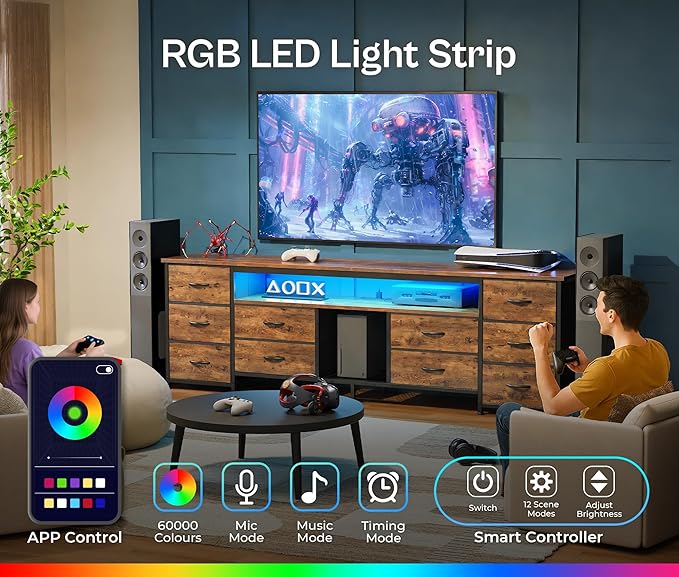 - 【LED TV Stand with Power Outlets】With 4 AC outlets, 2 USB ports, and a USB-C port, your TV, soundbar, and gaming gear are always charged and ready. Want to set the mood? The built-in LED lights on the bedroom dresser bring your room to life, choose from over 60,000 colors, sync with your music, or schedule lighting scenes via app. Perfect for gamers who want immersive RGB lighting