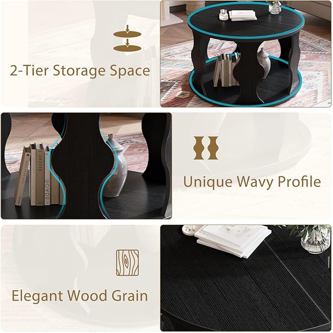 - Unique Wavy Profile with Modern Touch – Featuring sculpted wave-shaped supports inspired by vase forms, this modern round middle coffee table combines retro artistry with a black oak finish, making it a stylish focal point for vintage, farmhouse, minimalist, or contemporary living room.
