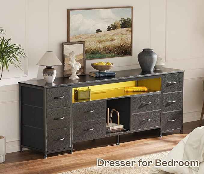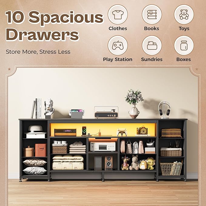 - 【10 Drawer Dresser with Storage】Featuring 10 drawers in 2 sizes, this led dresser for bedroom has a stunning storage, allowing you to neatly organize and store your media devices, DVDs, gaming consoles, books, other accessories. The drawers are great for additional, out of sight storage. You can also store your items on the shelves in the middle