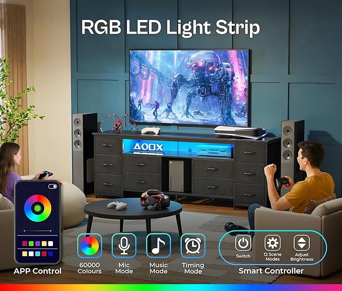 - 【LED TV Stand with Power Outlets】With 4 AC outlets, 2 USB ports, and a USB-C port, your TV, soundbar, and gaming gear are always charged and ready. Want to set the mood? The built-in LED lights on the bedroom dresser bring your room to life, choose from over 60,000 colors, sync with your music, or schedule lighting scenes via app. Perfect for gamers who want immersive RGB lighting