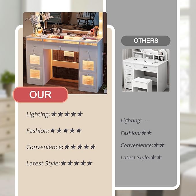 - 【Power Outlet & Easy Assembly】Equipped with a power outlet for convenience and tools for easy assembly, this white vanity table simplifies your daily routine.
