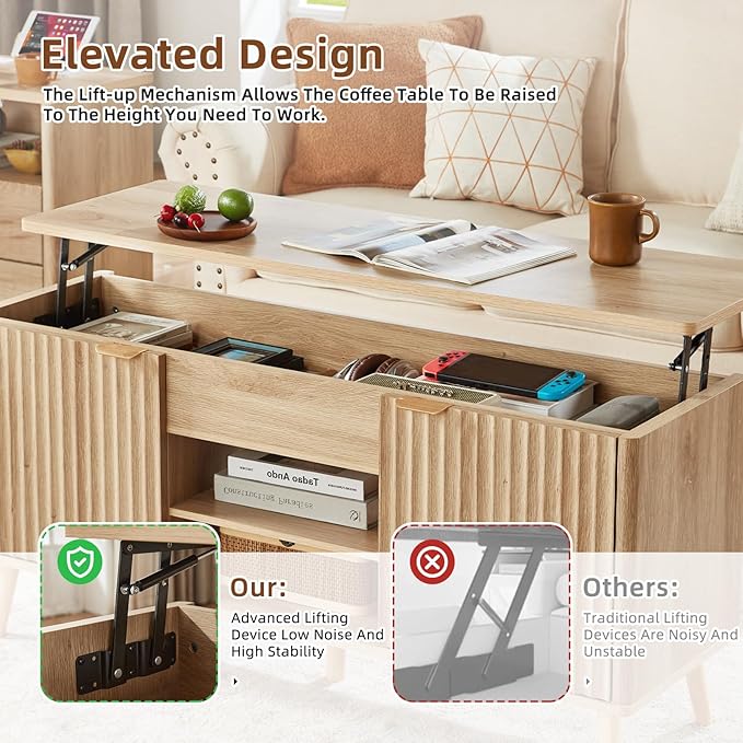 - [Lift Top Coffee Table] This coffee table with storage raises the table top to a more comfortable height for your convenience. The lifting mechanism features high-quality hinges with gas support rods, allowing effortless height adjustment while ensuring stability and durability.
