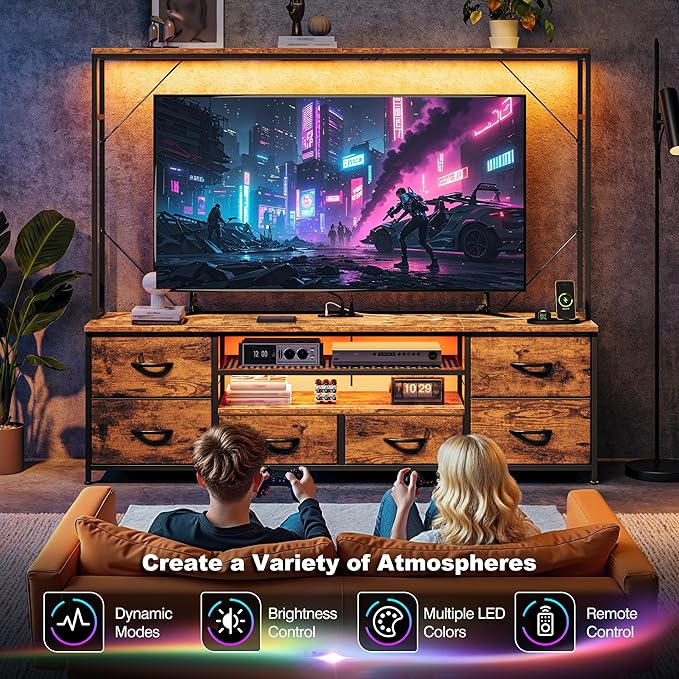 - 【Charging Station & LED Lights】This Tv stand with storage is equipped with LED lights on the wooden top and open shelves, have 7 full-color dynamic modes and 7 static modes for you home Create a Variety of Atmospheres. Built-in Charging Station have 2 AC Outlets & 2 Ports, Charge your TV, speakers, gaming devices at any time. This Tv stand for bedroom has two large cable holes in the back to help you organize various wires and keep your chargers and cables organized