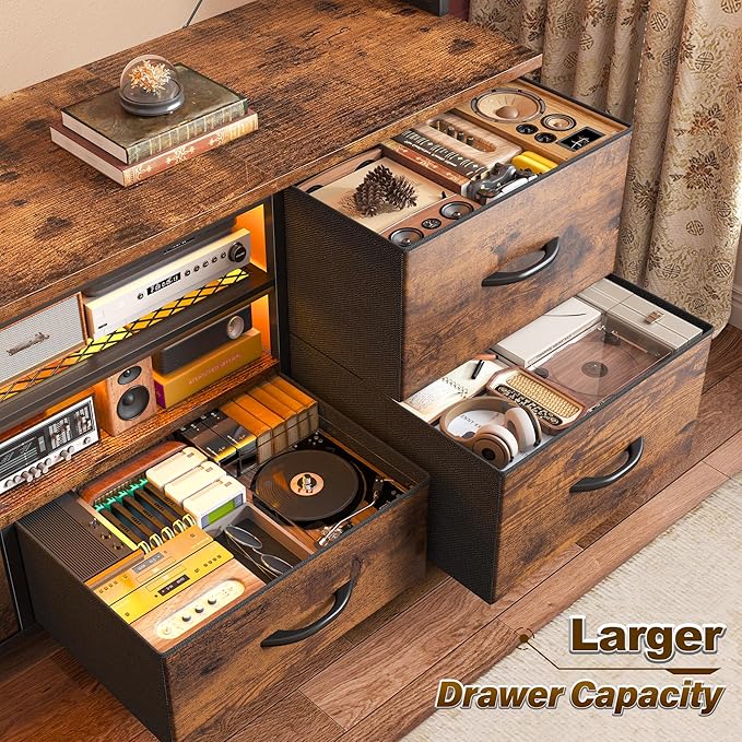 - 【Multi-functional large storage space】This Tv stand dresser have 6 large folding fabric drawers and two floors open shelves for flexible storage 70 Clothes, 15 Ornaments, 100 Socks, 15 Bag, 40 Scarf, clothes, beddings and more,has extra wooden top to place your books, picture frames, lamps, handmade decorations, vases, plants to decorate your living room tv wall