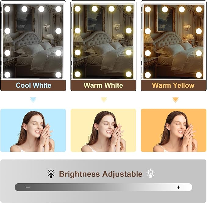 - 【Stylish Sliding Makeup Vanity Mirror】: The sliding mirror on our vanity desk features 10 LED lights, offering bright and adjustable lighting for flawless makeup application. Choose from 3 color settings - Cold white, warm white, and warm yellow - to create the perfect ambiance for your beauty routine.