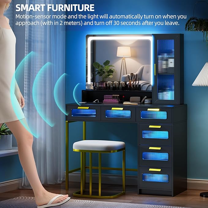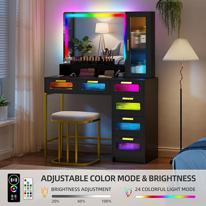 LED Make Up Vanity Desk with 20" Mirror and Light, Smart Dressing Table with 6 Drawers, 3 Shelves, 24 Color Lighting Modes, Cushioned Stool, USB Type-C Storage for Bedroom Dressing Room Black
