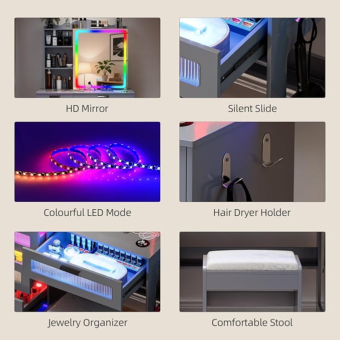 - 【RGB color modes Light & Premium Mirror】:This newly upgraded dressing table with HD Explosion-proof mirror features enhanced light sensitivity and adjustable brightness. With 14 color modes (7 dynamic RGB color+ 7 static RGB color). It ensures adjustable brightness to meet various makeup needs. Solving the problem of dim mirror lighting and finding your makeup spotty when you go out