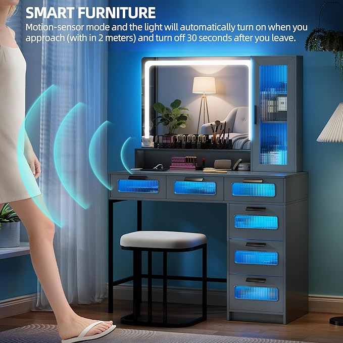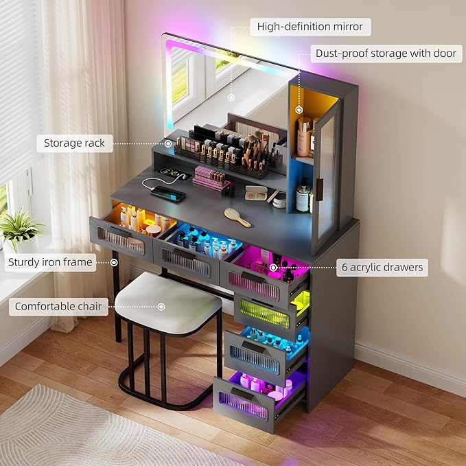 LED Makeup Vanity Desk with 20" Mirror and Light, Smart Dressing Table with 6 Drawers, 3 Shelves, 24 Color Lighting Modes, Cushioned Stool, USB Type-C Storage for Bedroom Dressing Room Gray