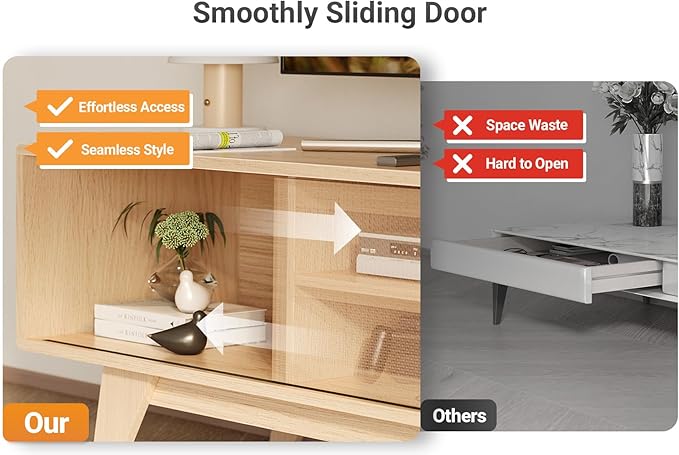 - Fashionable & Functional: The rounded corner design is child-friendly, both beautiful and safe. This TV console combines modern and boho styles, featuring natural rattan cabinet doors that complement any decor.