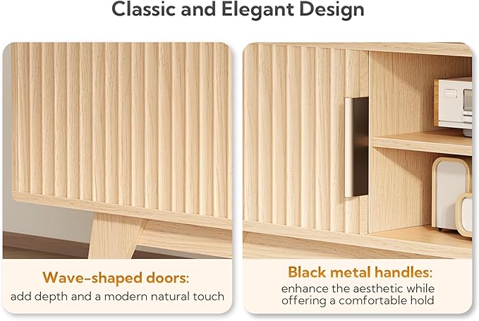 - Elegant Mid-Century Modern TV Stand: This TV stand embodies authentic modern style with a walnut finish and trapezoid legs. Two antique fluted doors with metal handles create a striking visual statement, blending vintage charm with contemporary elegance.