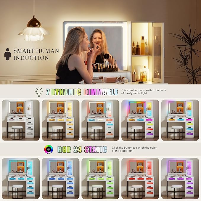 - 【Powerful Storage Capacity】White makeup desk comes with 6 RGB drawers,storage cabinet,Acrylic lipstick grid and an open storage shelf,which can classify and store all cosmetics and skincare products