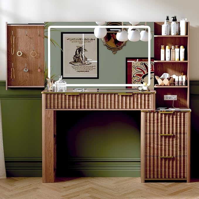 Modern Vanity Desk with Mirror and Lights, 49.2'' Fluted Makeup Vanity Desk with 5 Drawers and Shelves,Dressing Table with Glass Top and Power Outlet for Bedroom,Walnut